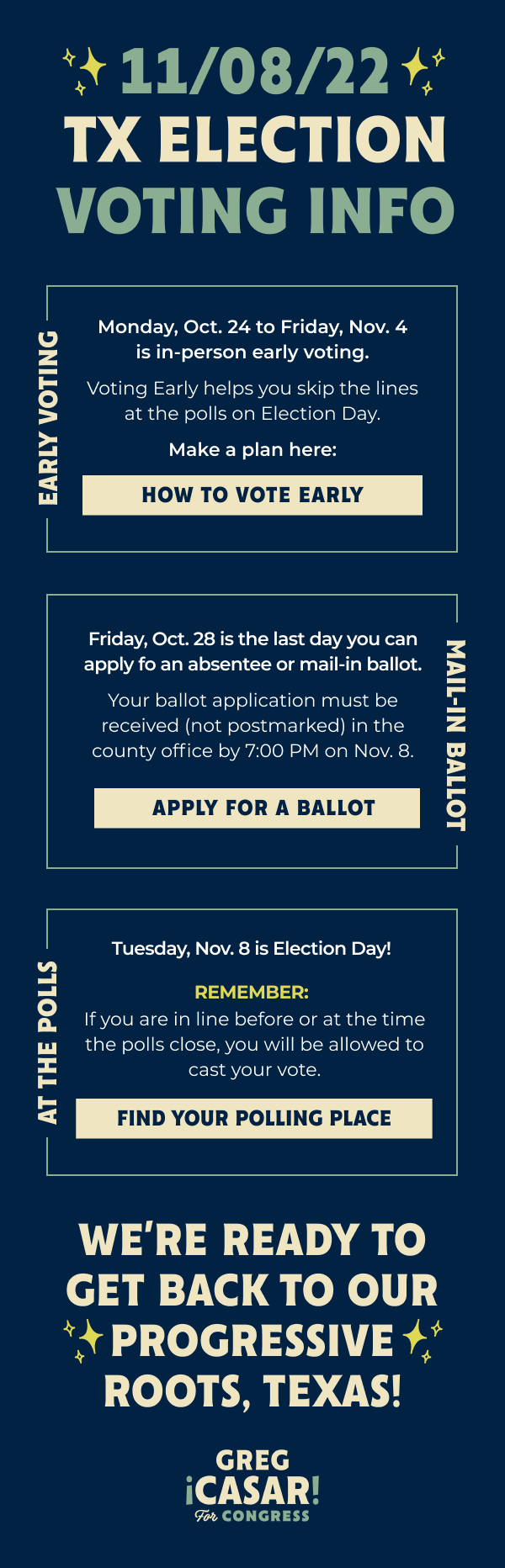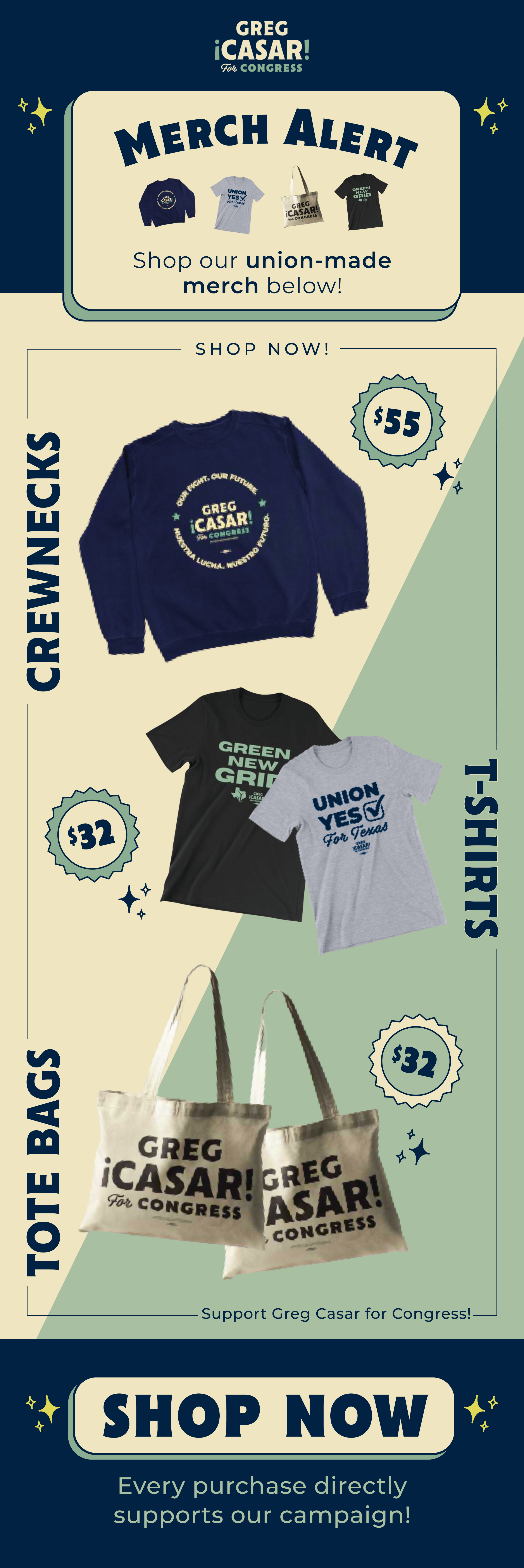 Select Direct Response ad, email, and merch designs for Congressman Greg Casar.